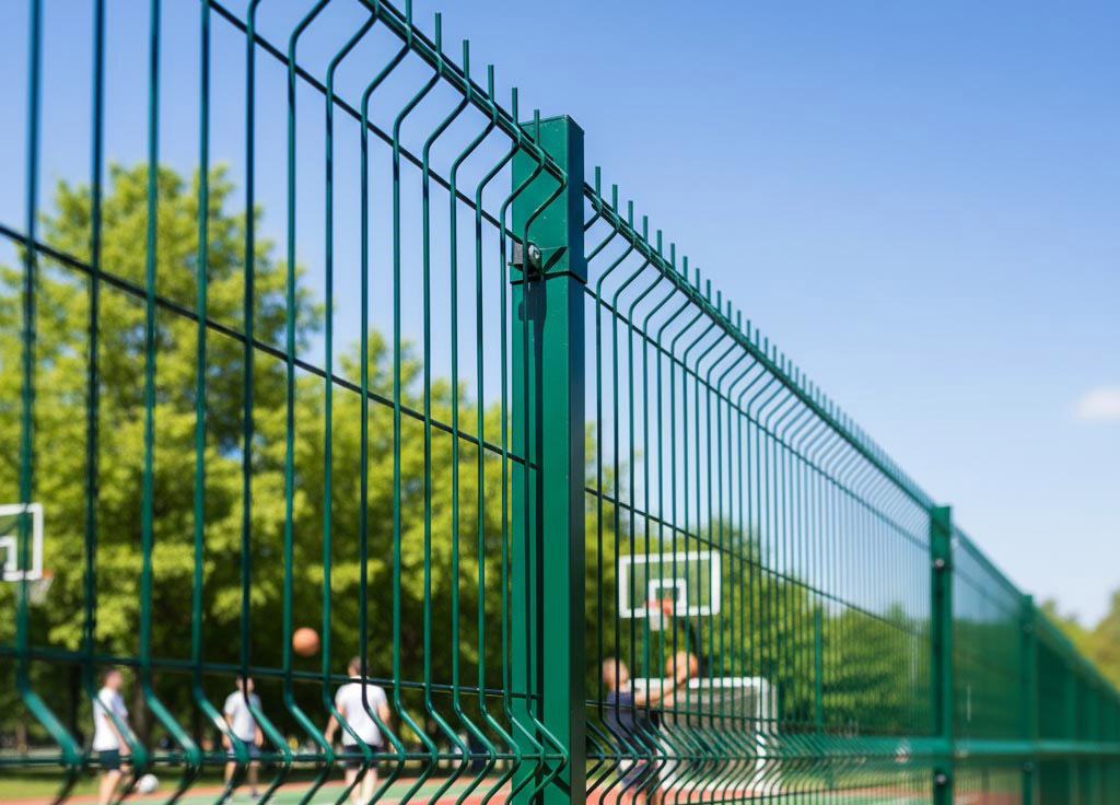 - Использование сетки-рабицы. Для общественных, детских и спортивных площадок рабица не рекомендуется из-за низких ударопрочных свойств, повышенной шумности и травмоопасности (острые концы проволоки). Сварные 2D и 3D панели значительно надежнее и безопаснее.